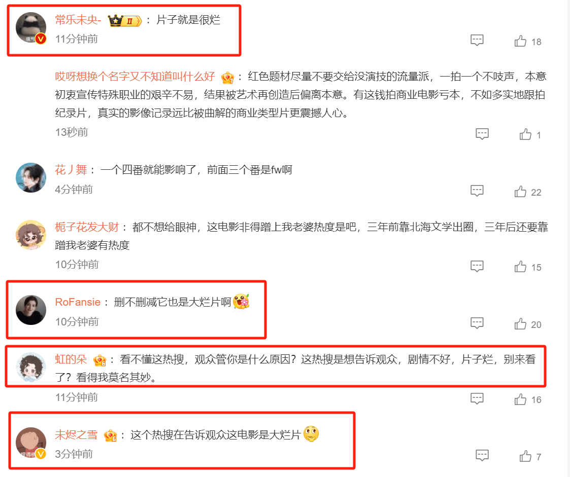 好在有不少理性的观众不吃这一套,都什么年代了,还在这给我上价值?评论“删不删减也是大烂片”,以及“这个热搜在告诉观众这电影是大烂片?”等等。
