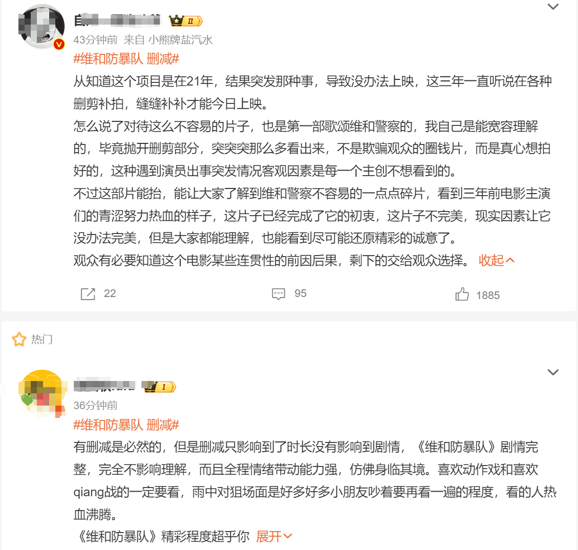 眼瞅着剪辑的问题被广泛吐槽,电影宣发方想了个招“迂回”挽尊,找了几个营销号,弄出来了一个“维和防暴队 删减”的热搜(如果你非要说这是营销号自发维护电影我也没话说,杠就是你对)。