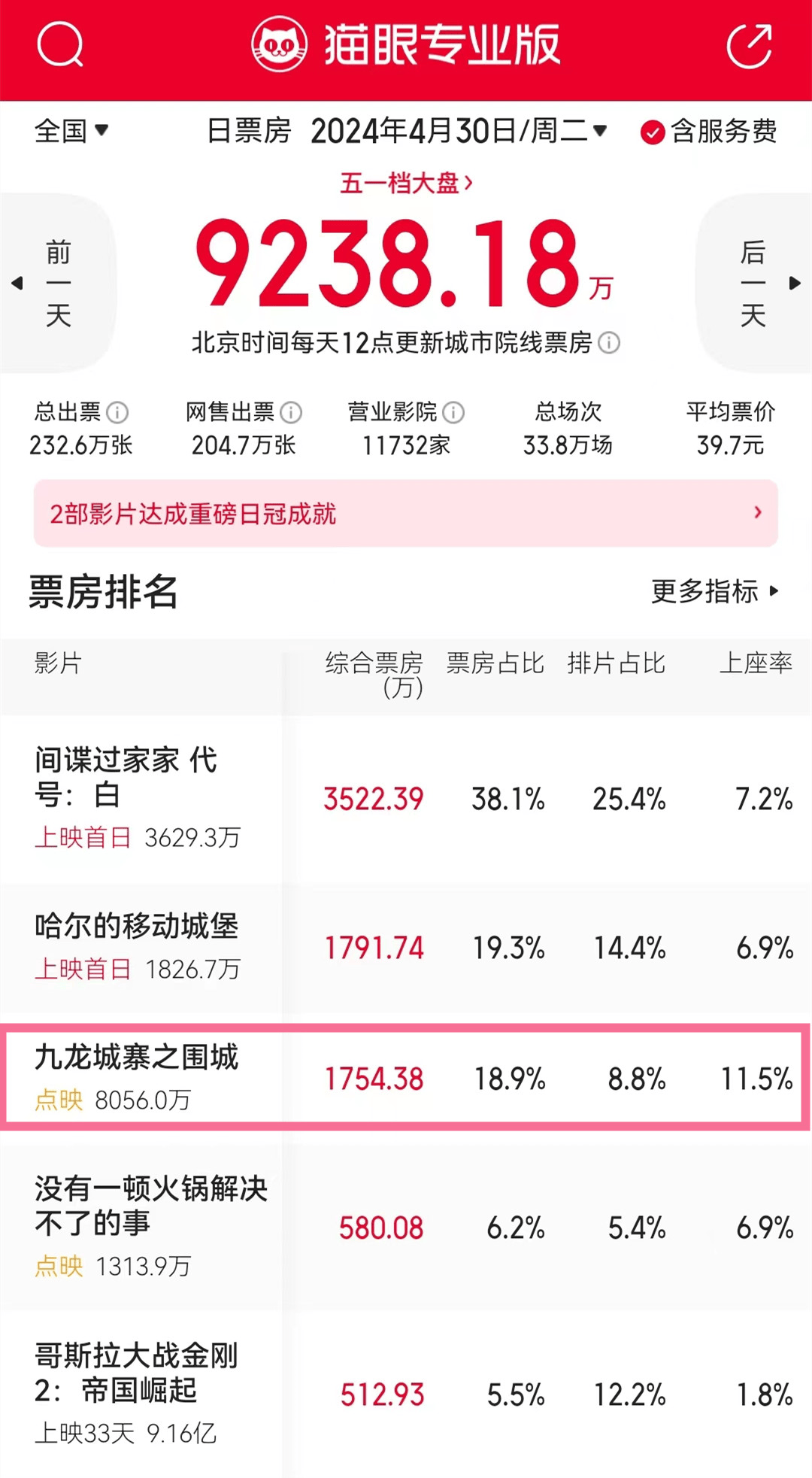 应该很多人都没想到,今年五一档第一部票房破亿的新片,竟然是片名“土里土气”的《九龙城寨之围城》。凭借点映期的好口碑与高上座率,它在5月1日正式上映前便已积累了8061万人民币的票房,因此即便预售不占优势,却依然率先实现了 “小目标”。