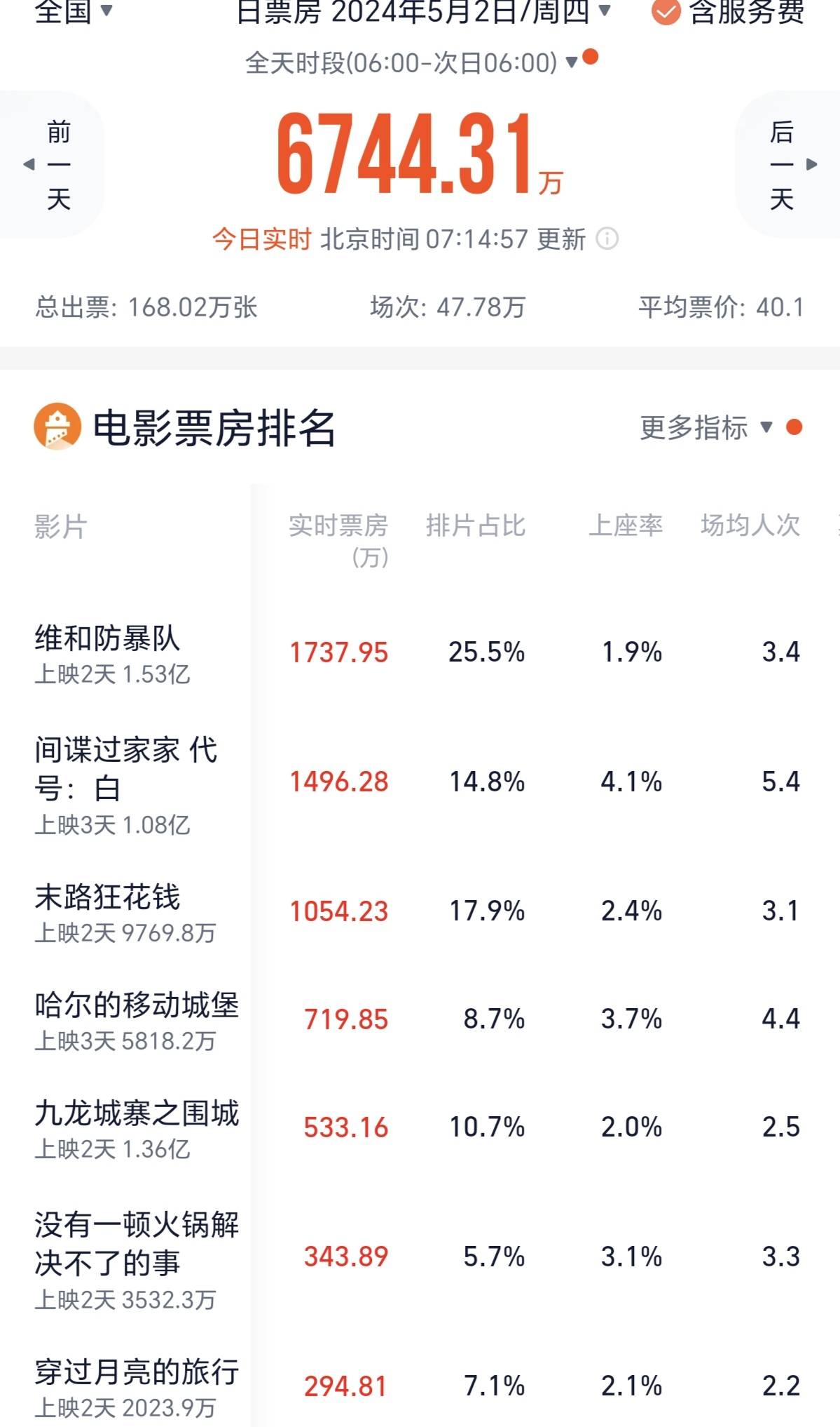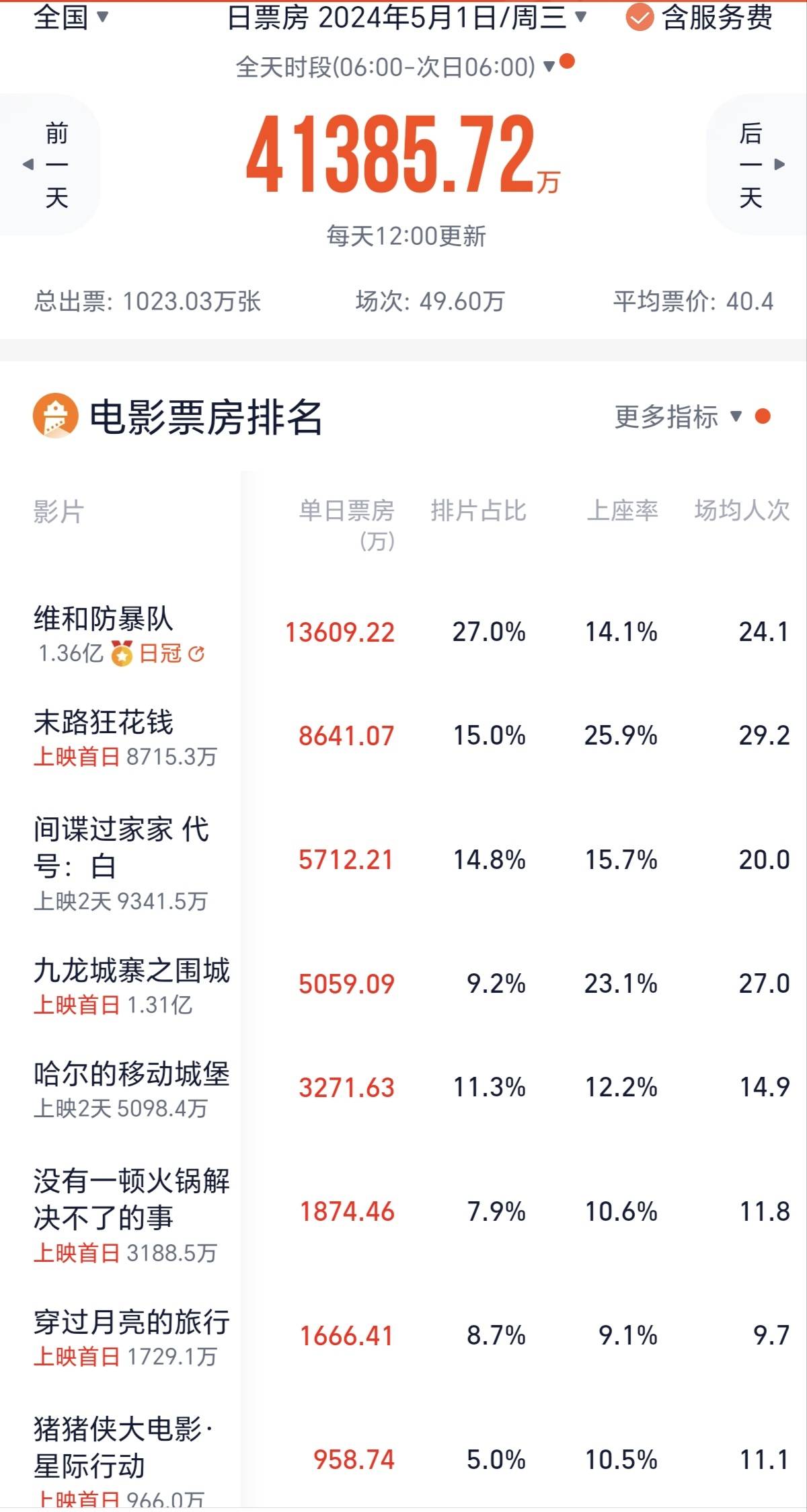 原标题:五一票房超4亿影史第三 《维和防暴队》夺冠《末路狂花钱》上座率最高