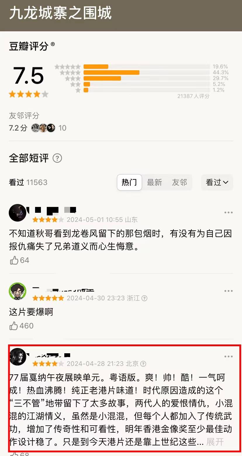 郑丹瑞导演的《九龙城寨之围城》入围戛纳电影节午夜展映单元,说明品质还不错,否则很难入围。这部电影豆瓣评分已经出炉7.5分,应该还不错,至少中上,并不是不及格。