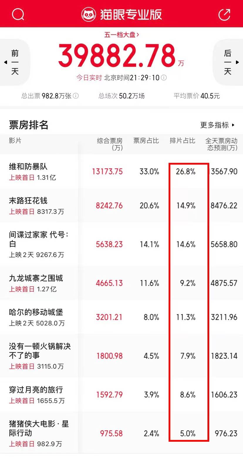 院线的排片占比也是看不懂,《九龙城寨之围城》口碑预售都很不错,居然排片占比居第四位,不算很好,但票房已经破亿,这个搞什么,真的看不懂。