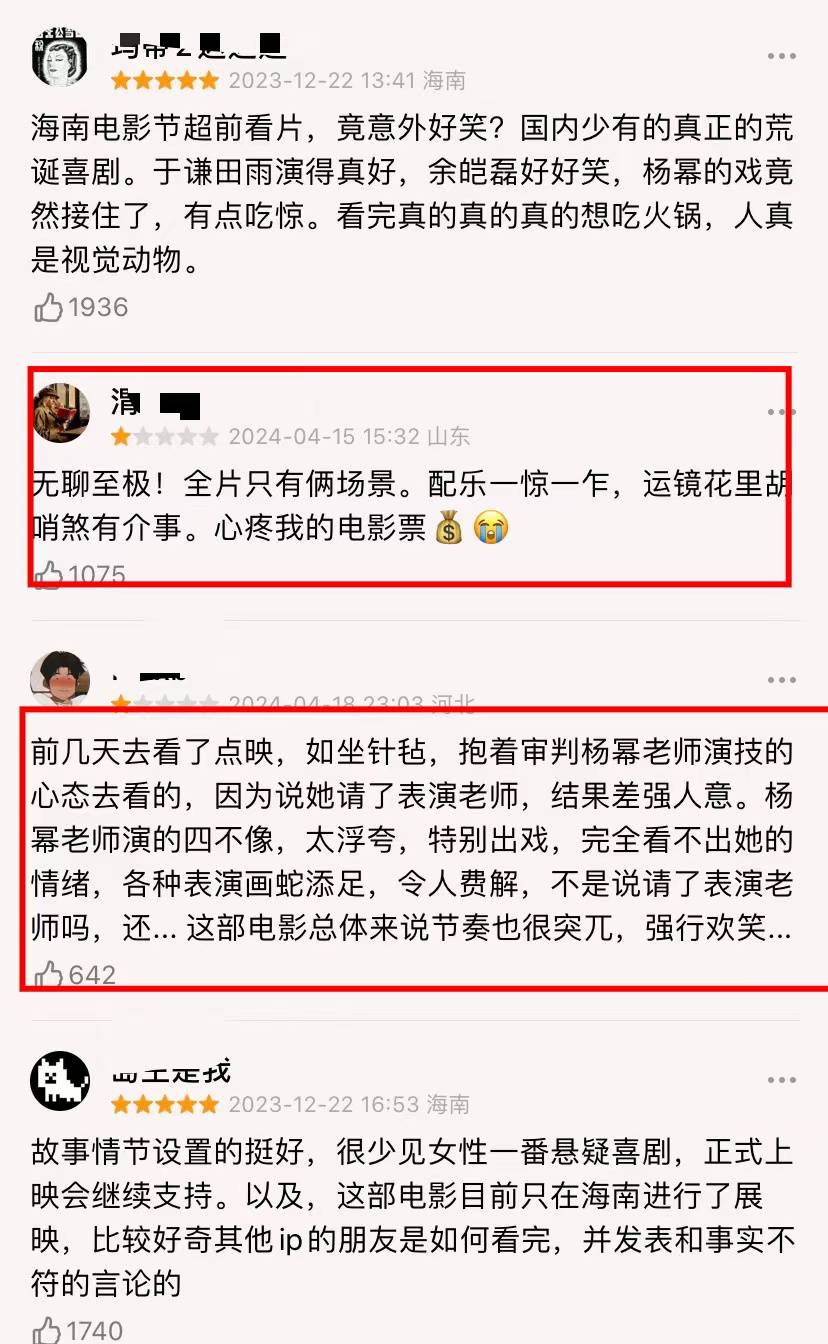 有网友评价杨幂的演技还是不行,虽然请了表演老师指导,但结果不是很好,表演浮夸,特别出戏,完全看不出她的情绪,各种表演画蛇添足,令人费解。还有人认为她的台词很出戏,看来她的问题最大还是台词功底不是很强。排片占比很低,估计院线都不看好。