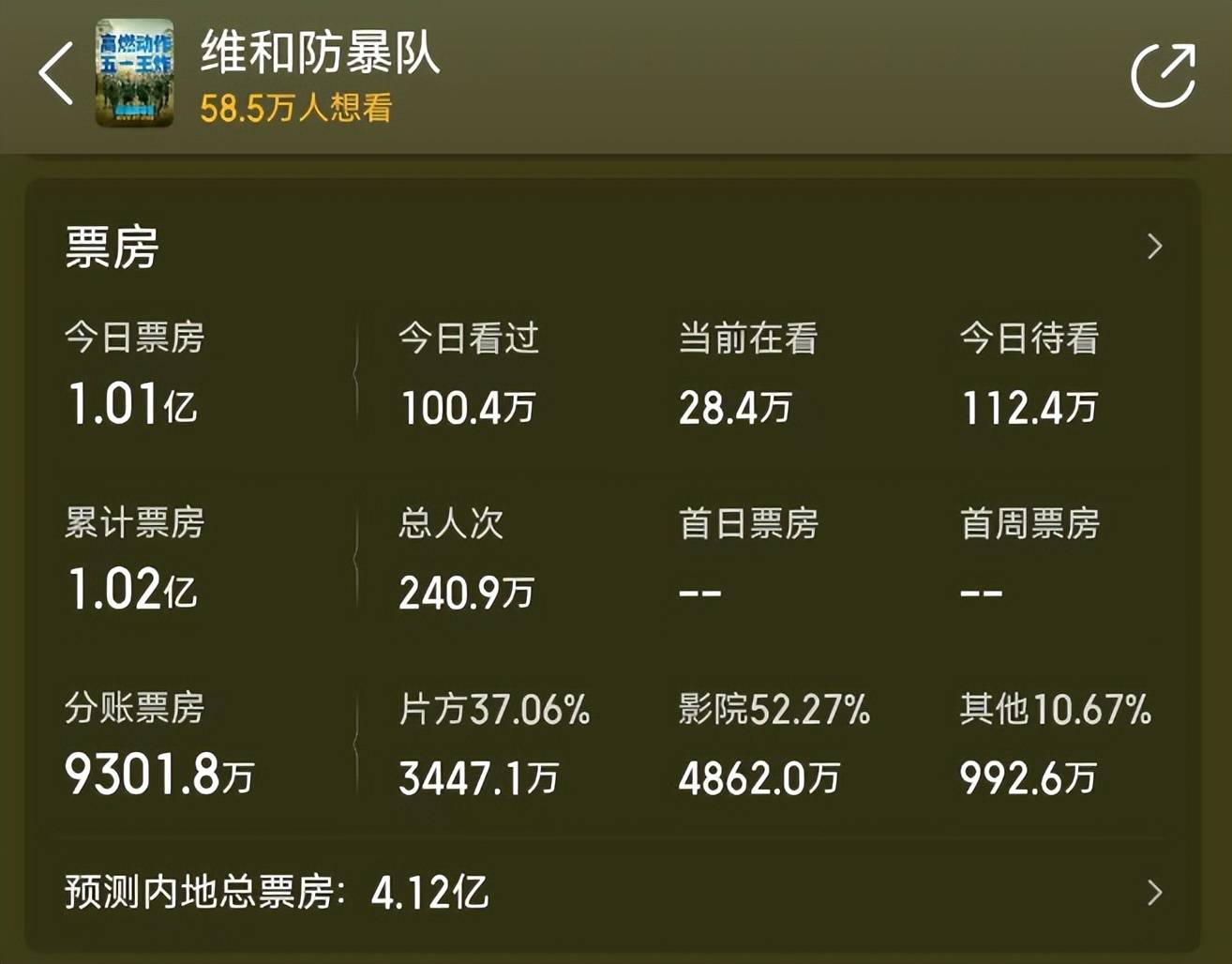 海外维和题材、枪林弹雨火箭爆炸,再加上黄景瑜、王一博、钟楚曦、欧豪等顶流明星,《维和防暴队》想不领先都难。然而,首日票房过亿,可专业平台却只给出4.12亿的总票房预测,是系统BUG吗?