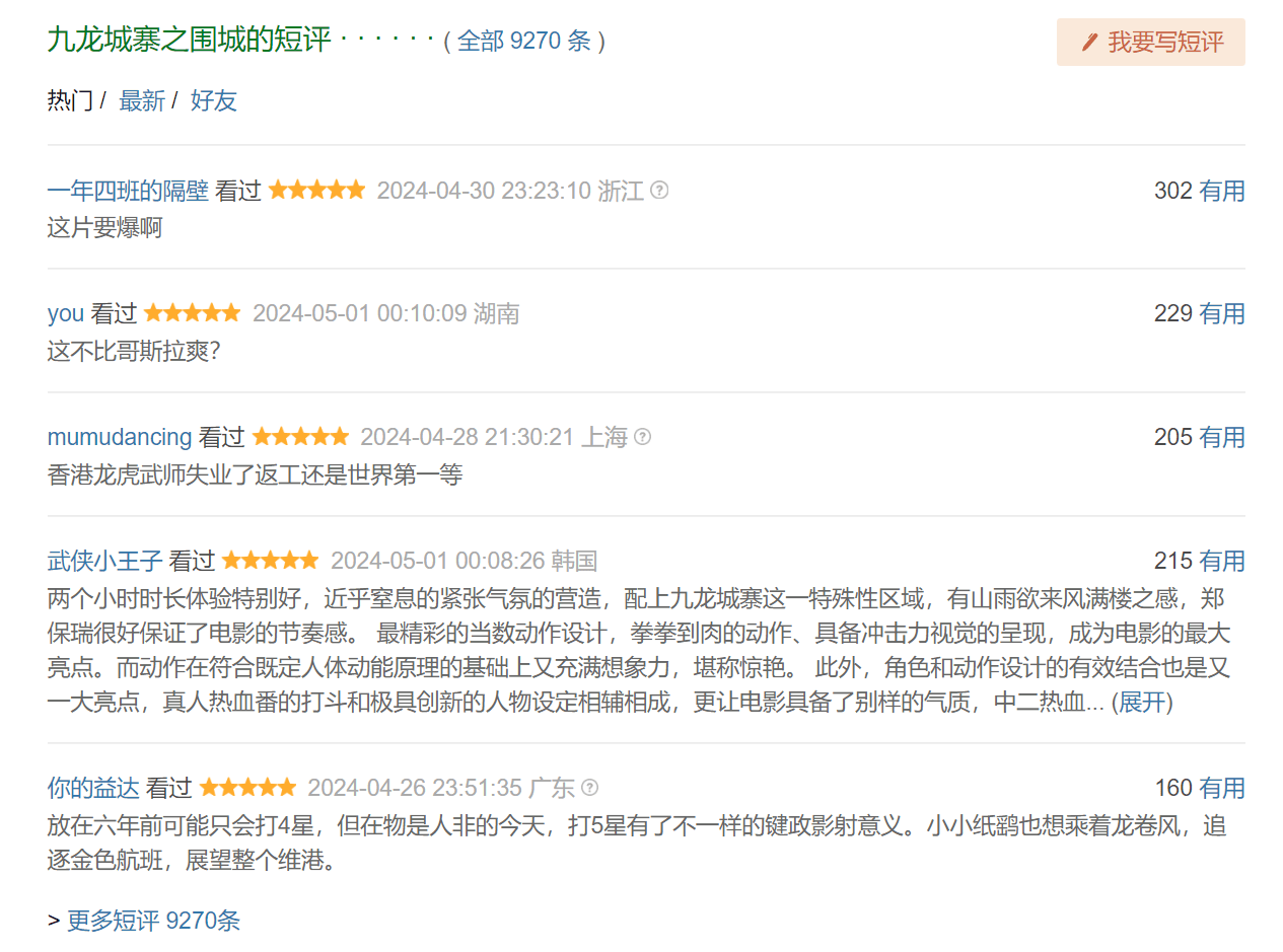 豆瓣评论和我的观点一致,《九龙城寨之围城》首页随机显示的五条短评清一色五星,电影动作拳拳到肉、中二热血,气氛营造的极为紧张,剧情编排得当,有环环相扣、一气呵成的感觉,无论是冷兵器的对决还是拳脚厮杀都不乏新鲜感,结尾王九破功,陈洛军被龙卷风吹上天台,夸张却不失宿命感。洪金宝、古天乐、林峯和刘俊谦等,香港老中青三代合力又接力,奉上这部精彩的港式动作片,两个多小时的时长、多场热血打斗,值回票价。