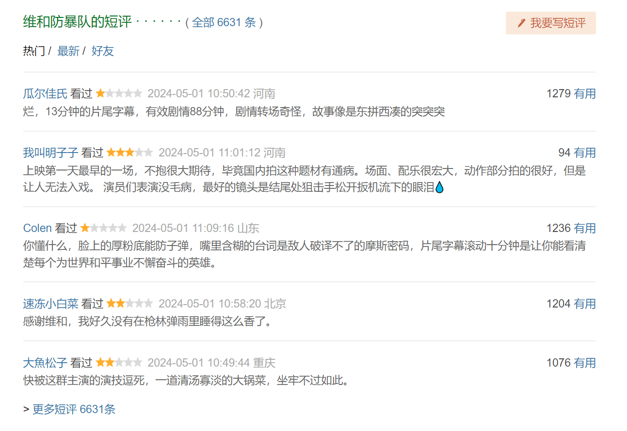 反观《维和防暴队》,豆瓣随机显示的五条评论有四条差评,而另一条打三星的也在抱怨电影让人“无法入戏”。不吹不黑,《维和防暴队》的缺点肉眼可见,不难总结。