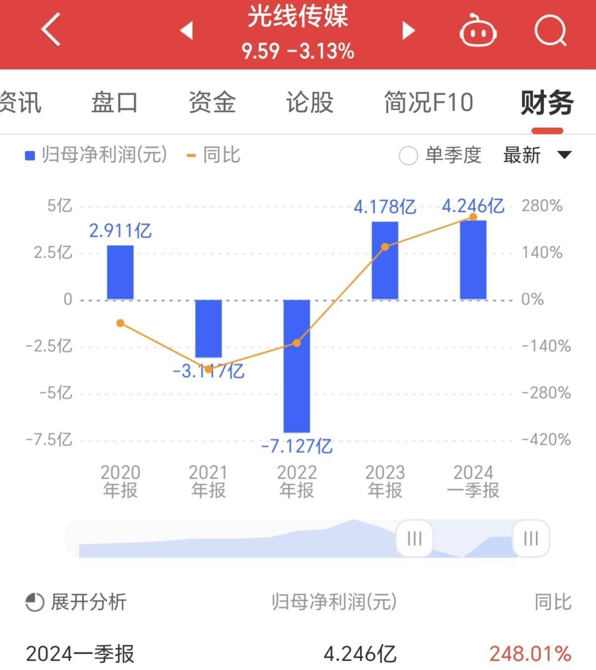 光线传媒2024年第一季度实现营收10.7亿元,同比增长159%。净利润4.25亿元,同比增长248%。
