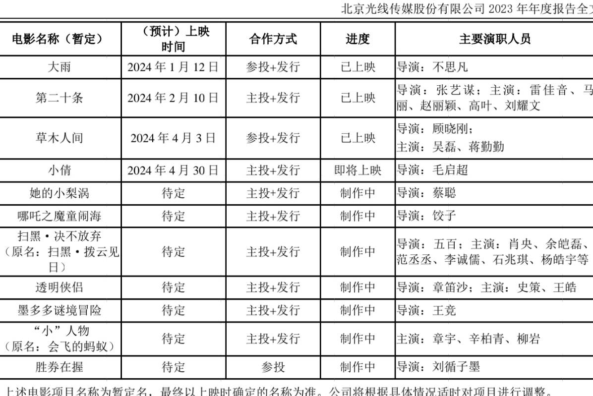 电影业务方面,一季度光线发行了动画片《大雨》和张艺谋的《第二十条》。《大雨》票房只有1729万元,投资方分账583万元,很可能亏本。《第二十条》卖了24.52亿元,投资方分账8.69亿元,是利润的主要来源。