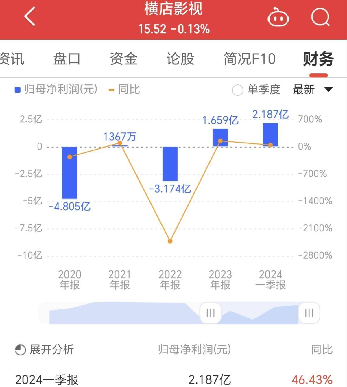 横店影视2024年第一季度营收8.42亿元,同比增长13.5%。净利润2.187亿元,同比增长46.43%。