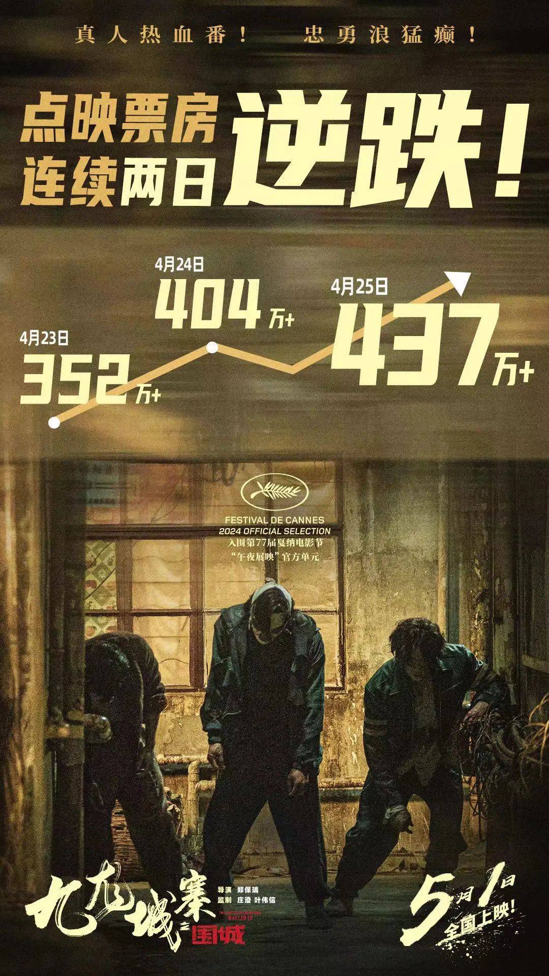 不同于传统犯罪题材港片,《九龙城寨之围城》是一部漫改作品,在首轮点映后,该片临场感与离场感均超出预期,获得了良好的观众反馈。片方也在此时进一步扩大点映范围至全国,最终在4月27日推动该片成为大盘日冠,并在28日和29日完成了三连冠。