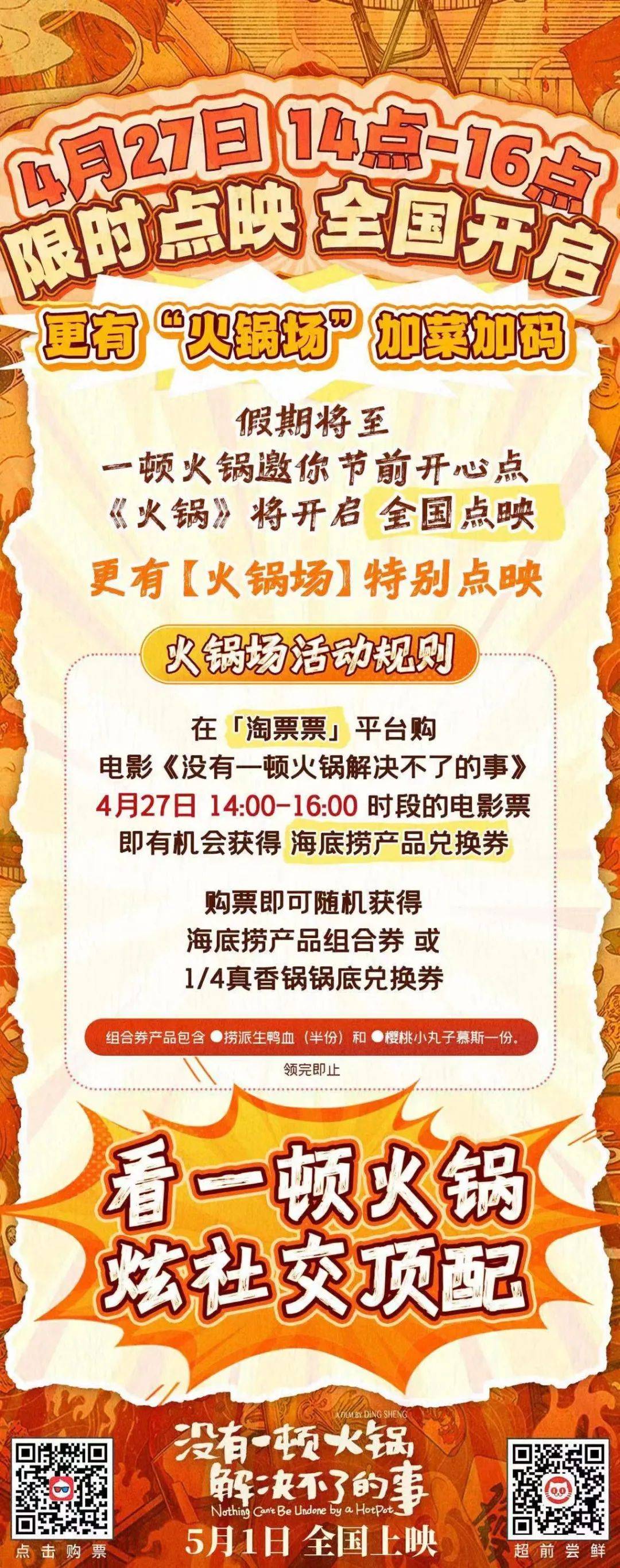 这部影片其实算是五一档最早开始点映的一批项目,定于4月13日和14日两天的14点至17点在全国20个二线城市进行了200场点映。尽管未选择火锅之都川渝,片方还是巧妙地用每一个点映城市的特色火锅加以包装,仪式感拉满。