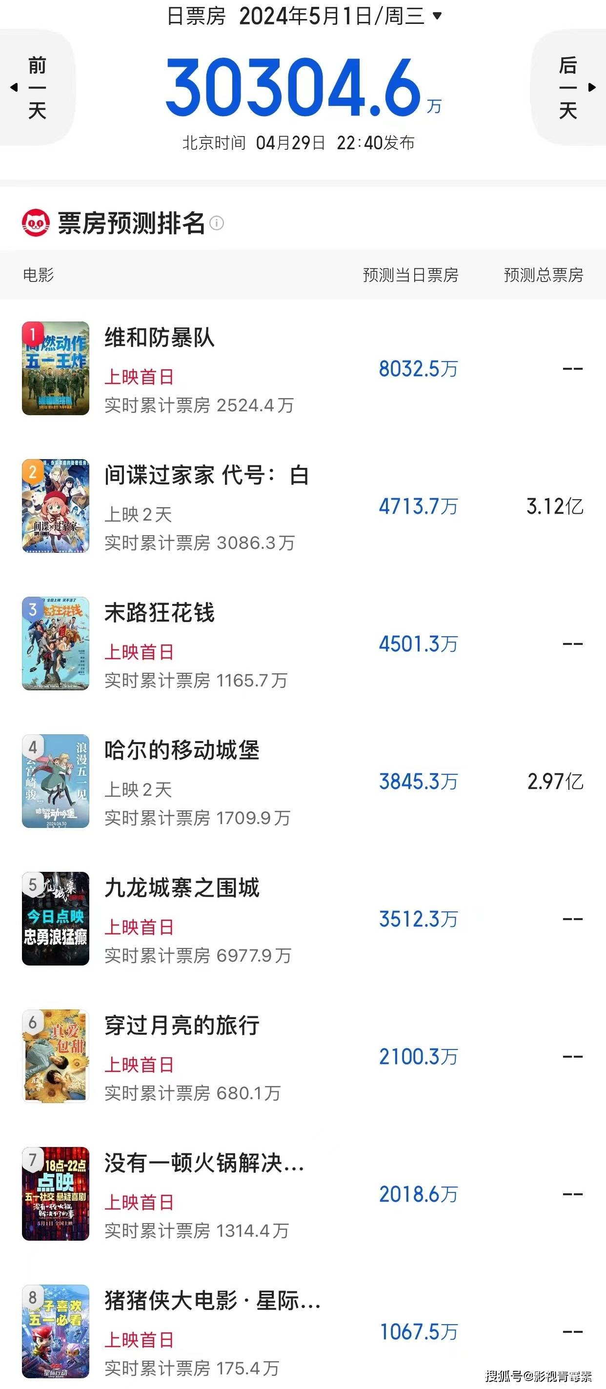 4月30日,五一档电影大战已经打响,有两部电影率先上映,都是动画片,分别是《间谍过家家:代号白》《哈尔的移动城堡》。真正的盛宴将在5月1日正式开启,除了几部动画片,还有5部电影争夺档期票房冠军,分别是军事动作片《维和防暴队》、无脑喜剧片《末路狂花钱》、浪漫爱情片《穿过月亮的旅行》、港式动作片《九龙城寨之围城》、喜剧悬疑片《没有一顿火锅解决不了的事》。
