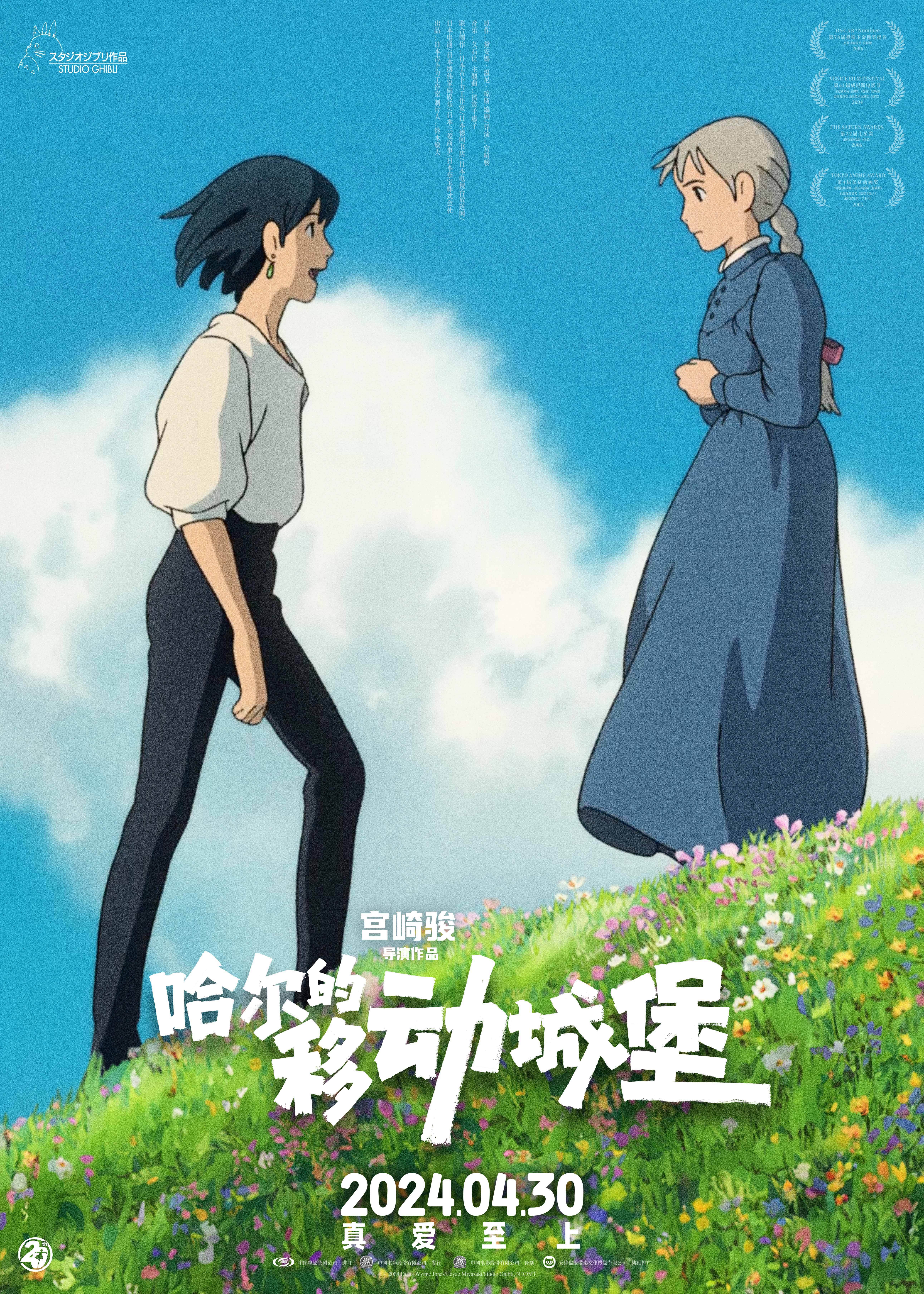 《哈尔的移动城堡》由宫崎骏执导,日本吉卜力工作室出品,中国电影集团公司进⼝,中国电影股份有限公司发⾏,中国电影股份有限公司译制,天津猫眼微影⽂化传媒有限公司协助推⼴。影片火热预售中,将于4月30日正式登陆全国各大院线。跨越次元拥抱爱,让我们一起共赴宫崎骏的浪漫春日之约!