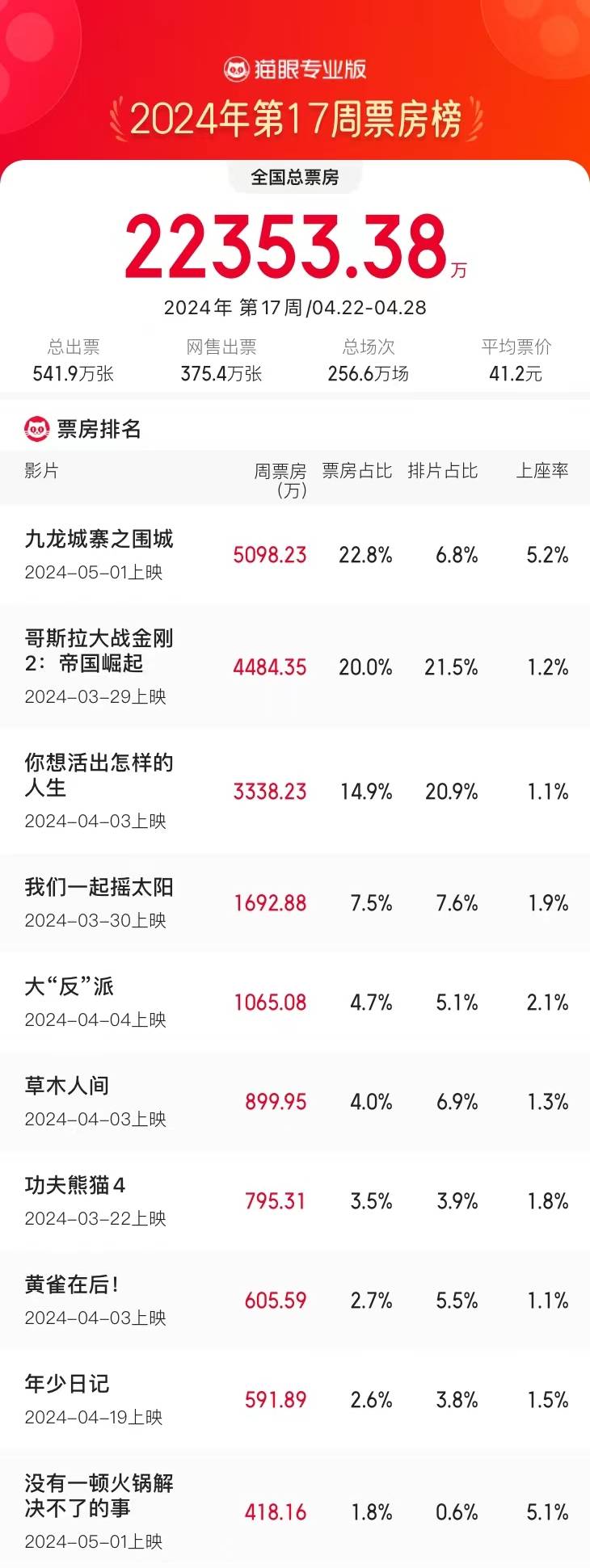 原标题:4.22-4.28内地票房2.23亿环比跌23.89% 《九龙城寨之围城》点映超5000万夺冠