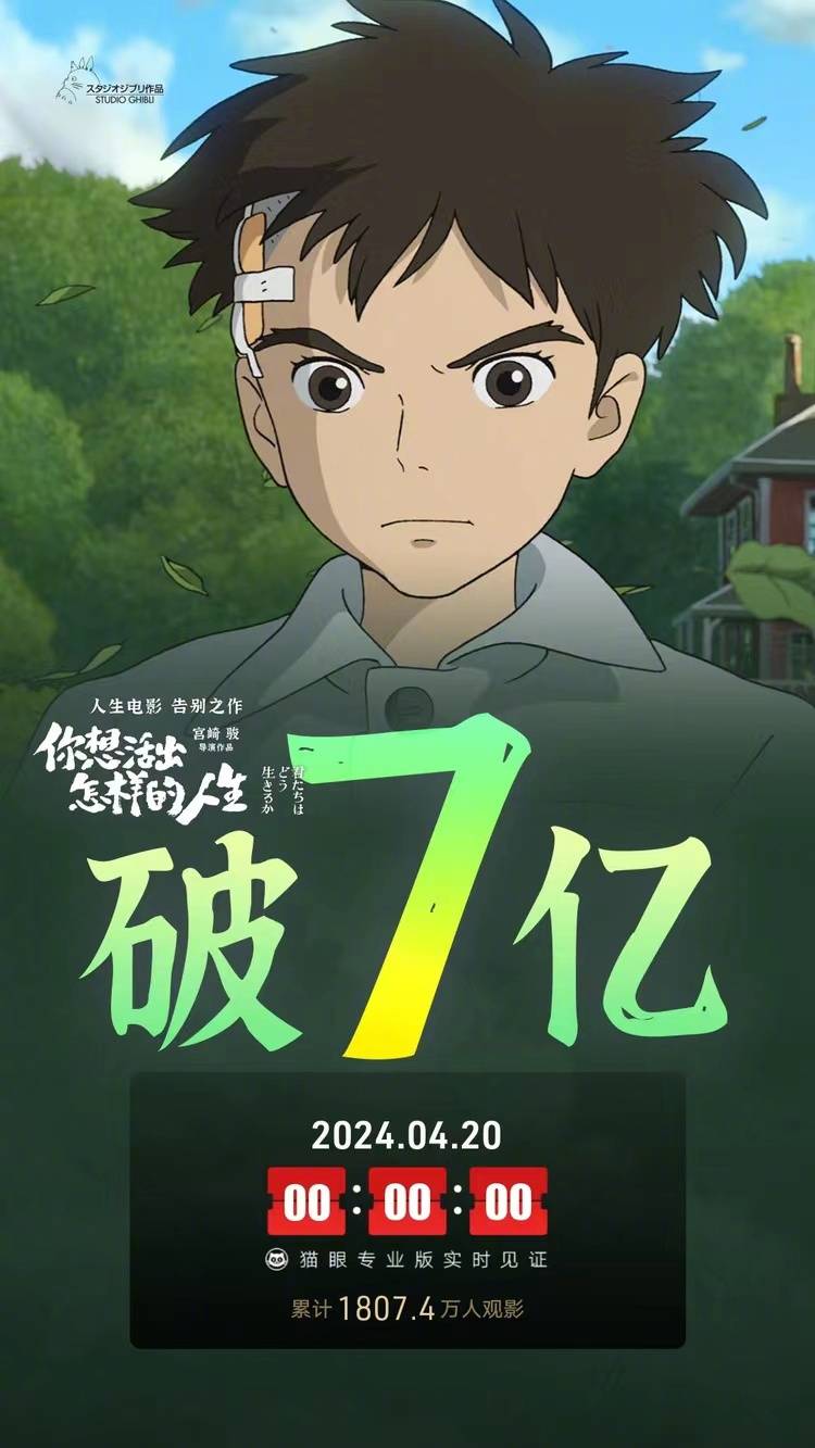 宫崎骏动画新作《你想活出怎样的人生》第四周进账3338.23万降为第三,上映26天累计票房7.68亿。