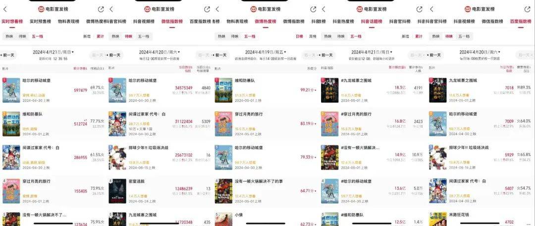 4月15日前,数据最好的是《哈尔的移动城堡》与《没有一顿火锅解决不了的事》。但到了4月15日预售开启后,《九龙城寨之围城》与《穿过月亮的旅行》开始发力,后来居上。目前所有电影的抖音话题播放量都在10亿 ,最高的为《九龙城寨之围城》。