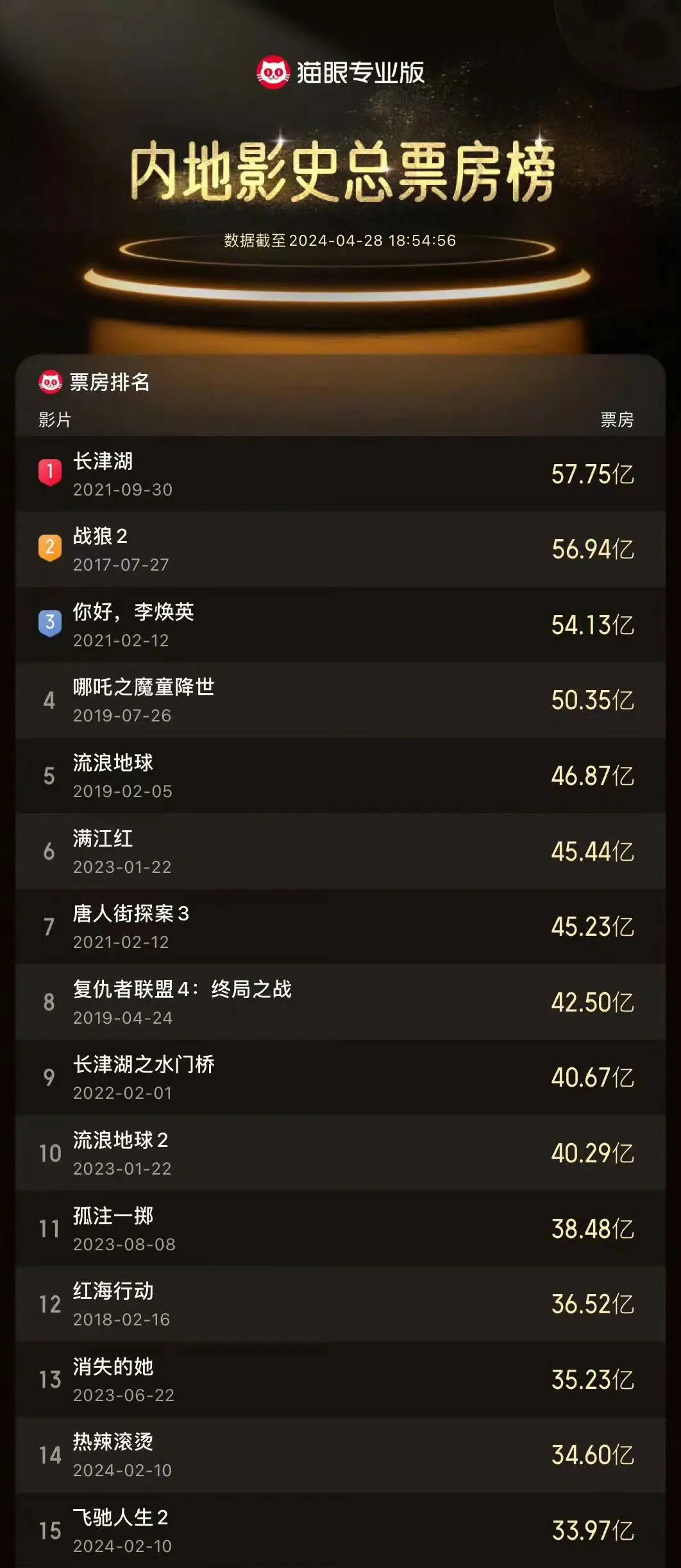 搜狐娱乐讯 4月28日,据猫眼专业版数据显示,电影《飞驰人生2》累计总票房破33.97亿,超《唐人街探案2》票房成绩,进入中国影史票房榜前15名。