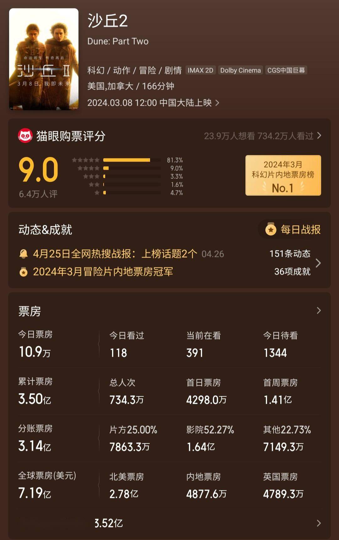 1905电影网讯电影《沙丘2》正在热映。截至目前,该片全球票房达7.19亿美元,成为本年度首个突破7亿美元大关的电影,其中北美总票房达2.78亿美元,中国内地总票房突破3.5亿元人民币(4877.6万美元)。
