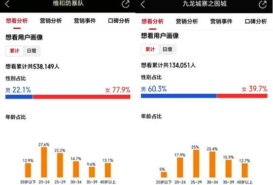 从题材看,属于动作、军警、战争类型的《维和防暴队》本应和《九龙城寨之围城》类似,是一部更受男性观众喜欢的电影。但事实却相反,该片的猫眼想看用户中,女性观众占80%,男性观众占20%。而《九龙城寨之围城》是男性观众占比超60%。