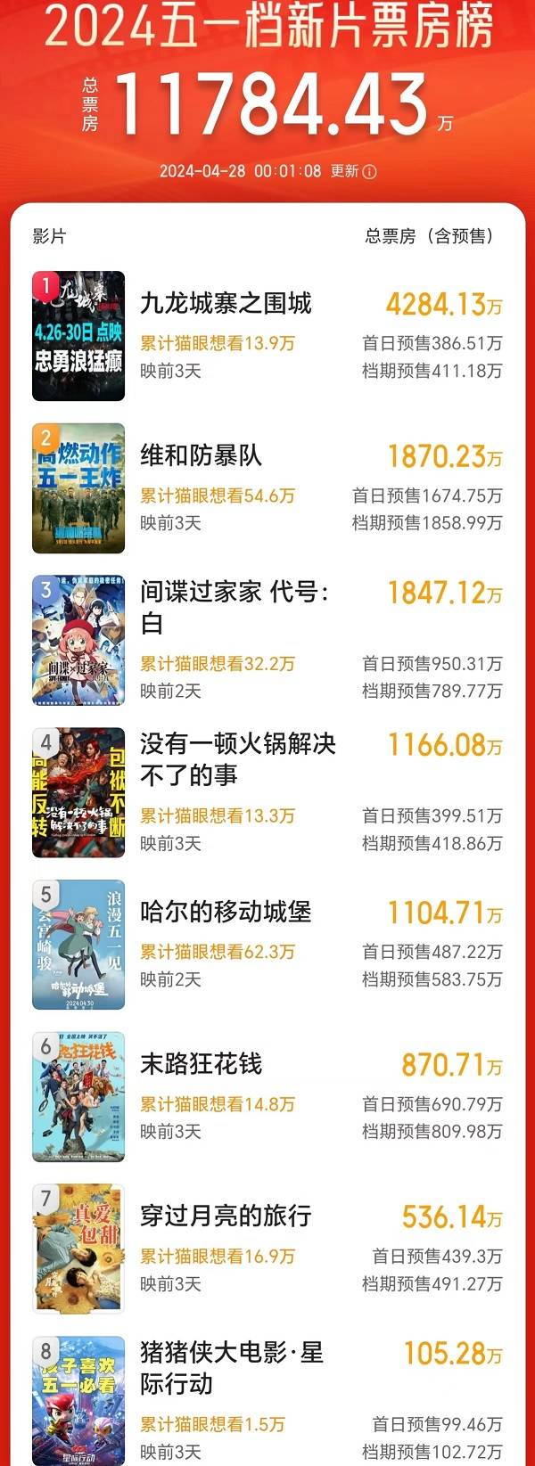 然后依次是《哈尔的移动城堡》《穿过月亮的旅行》《没有一顿火锅解决不了的事》《九龙城寨之围城》,这几部片排片都在10%上下,预售票房在387-519万之间,没有拉开太大差距。