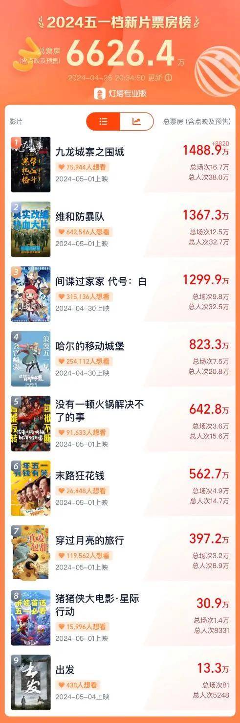 截至4月25日20时34分,灯塔专业版数据显示,10部定档2024五一档的新片共贡献了6626.4万元票房。《九龙城寨之围城》《维和防暴队》《间谍过家家代号:白》并驾齐驱,预售票房均突破千万元,暂列前三名。
