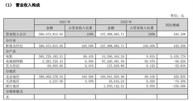 不久前,该片投资方之一的北京文化发布了2023年财务报告,该报告显示,2023年公司实现营收5.8亿元,同比去年暴涨443%,净利润为-2.7亿元,同比去年减少359.02%。