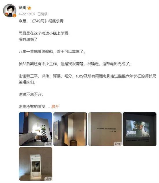 1905电影网专稿“今晨,《749局》彻底杀青。八年一直拖着这艘船,终于可以靠岸了。”4月22日,陆川发文官宣由其执导的《749局》杀青。同时,他也表示“虽然后期还有不少工作,但是我很清楚,很确定,这部电影完成了。”