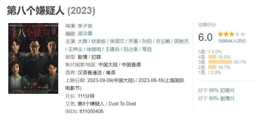 但《第八个嫌疑人》的口碑不佳,只是豆瓣6.0分的电影,内地票房也不到5亿元,可惜了大鹏的付出和精湛演技。