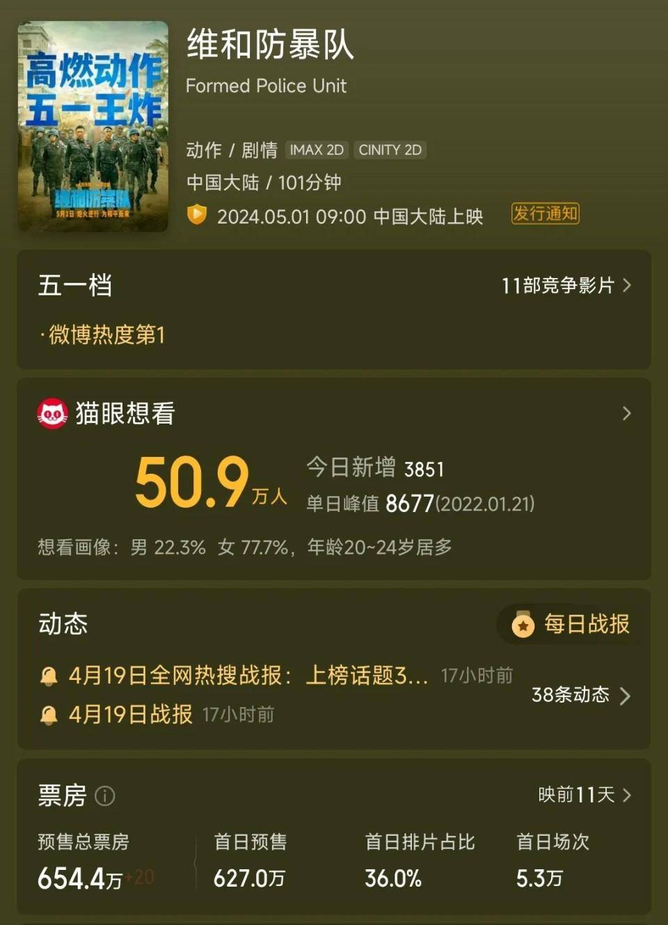 目前《维和防暴队》的电影票房已经达到了600多万元,这还只是预售成绩,所以很多人认为,这部电影将会站上五一档的票房巅峰。