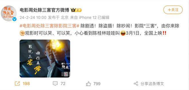 正如前文所言,该片的宣传点几乎强化在了第三幕的邪教段落,甚至影片主动带头造梗玩梗。首先在点映前,主动打出#电影周处除三害除影院三害“,杜绝反盗摄,精准捕捉了当时的社会热点,以及带动了第一批核心影迷的情绪。同时也为后期该角色造型成为表情包埋下伏笔。
