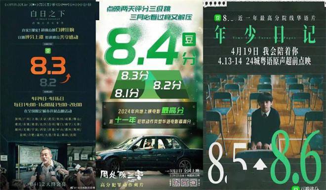 《周处除三害》《白日之下》《年少日记》三部影片本身的映前评分,就已高达8分之上,点映之后,均让评分或多或少实现了上涨。尤其是《周处除三害》,电影两天,豆瓣分从8.1分直接飙升到8.4分,这个成绩很难超越。