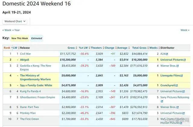 北美最新周末(4.19-4.21)票房出炉!A24口碑新片、亚历克斯·加兰(《湮灭》《机械姬》)导演《美帝崩裂》(翻译为《内战》)上映次周末收获1112.7万美元实现连冠,北美累计票房已达4488万美元。