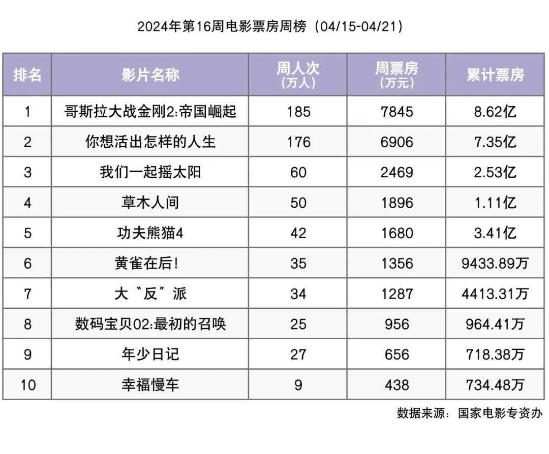 上周票房前三名分别是《哥斯拉大战金刚2:帝国崛起》《你想活出怎样的人生》与《我们一起摇太阳》,三部皆是已上映逾半月的影片。新片表现欠佳,市场缺乏强片入场。