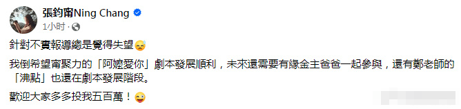 原标题:网传张钧甯为男友柯汶利新片出资500万台币 本人发文否认