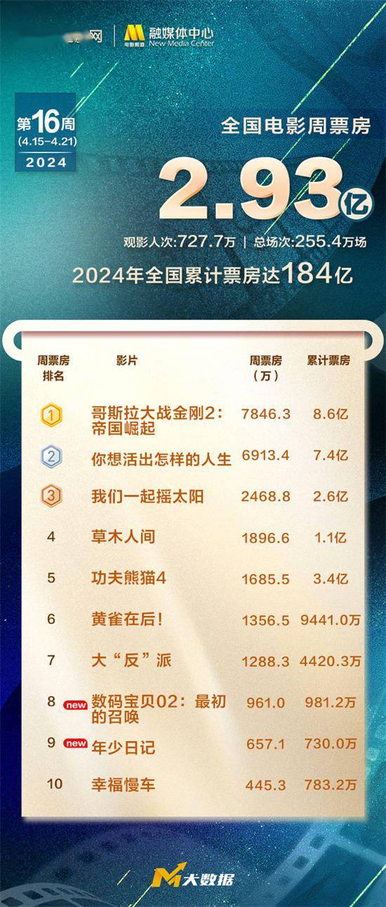 1905电影网讯2024年第16周(4.15-4.21)全国电影周票房2.93亿,观影人次超727万,总场次255.4万场,2024全年电影票房累计184亿。