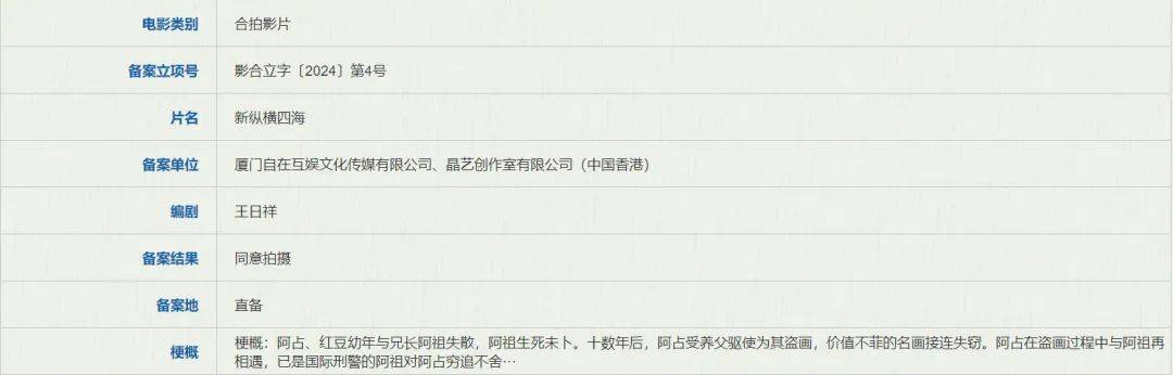 另外,由王晶编剧的电影《新纵横四海》也在备案公示中,该片翻拍自1991年的电影《纵横四海》,此前王晶已买下版权表示有意翻拍。