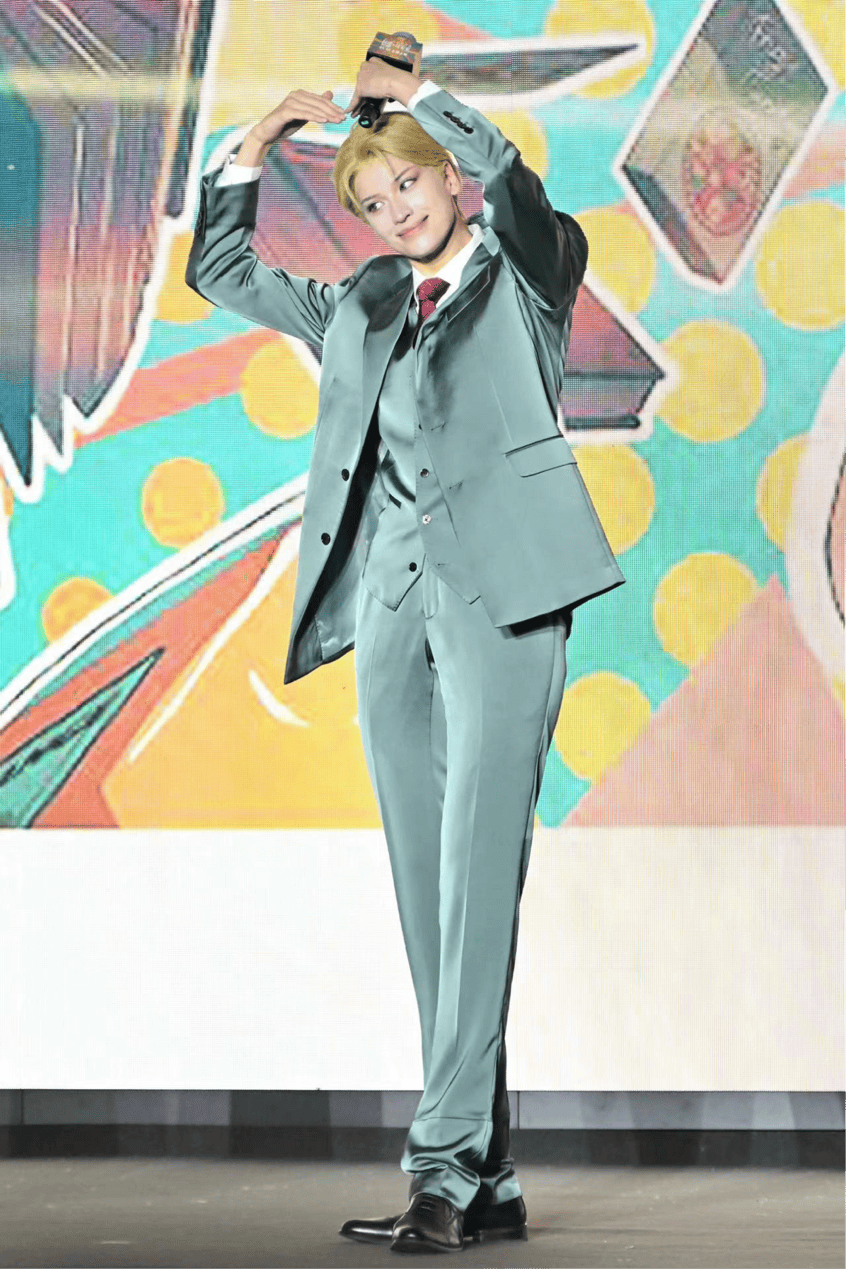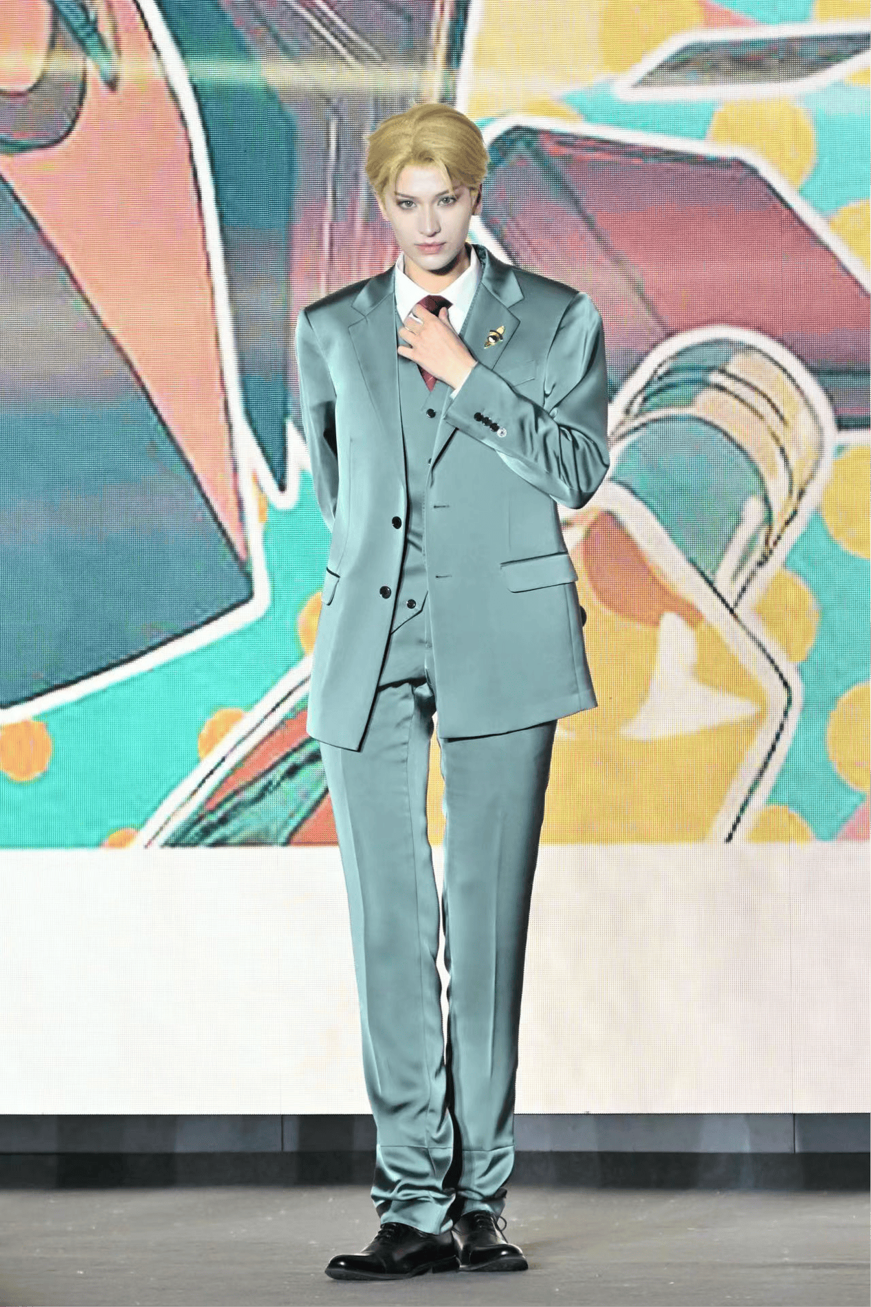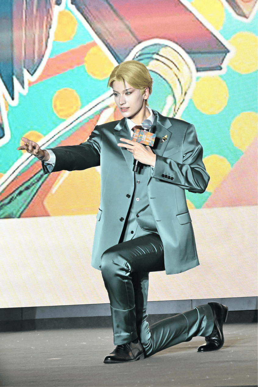 她身着灰绿色西装搭配红色领带,金色短发十分亮眼。这也是电影里重要人物“黄昏”的经典形象。现场,卡琳娜和粉丝亲昵互动、不停比心,还单膝跪地与“中奖”的粉丝一起还原了剧中黄昏“求婚”约尔的名场面。