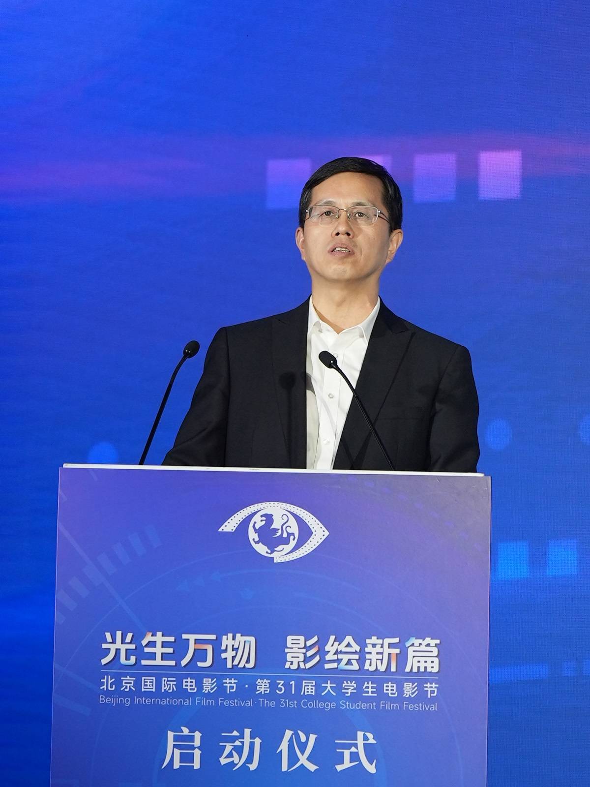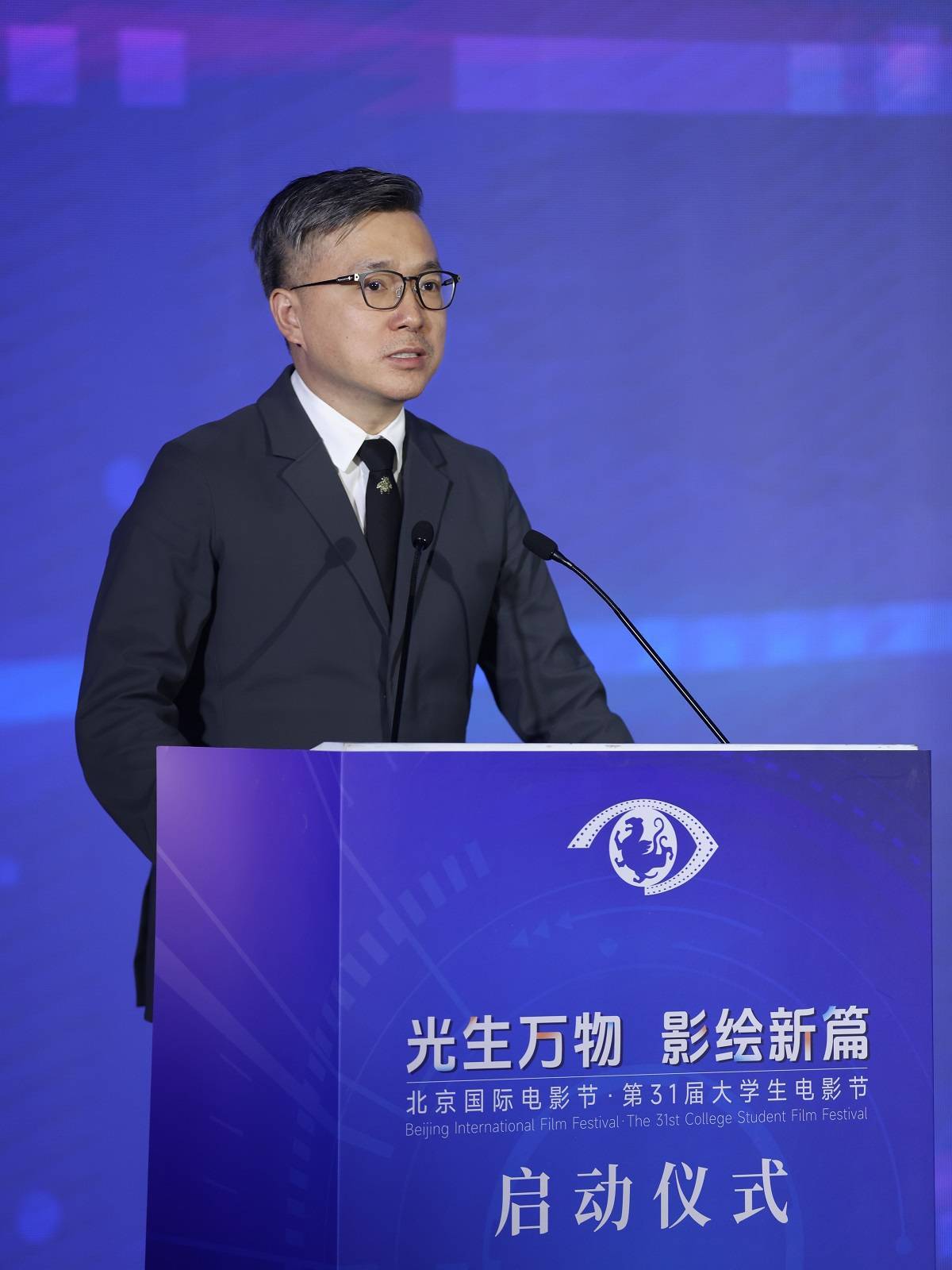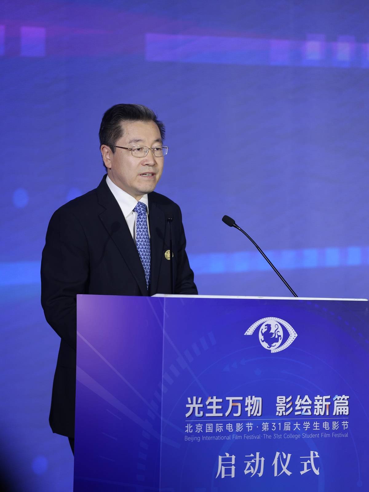 中共北京市委宣传部副部长,北京广播电视台党组书记、台长,北京国际电影节组委会副主席余俊生首先为启动仪式致辞,他表示,大学生电影节已走过30年历程,成为展示青年精神和形象的重要平台,本届电影节主题“光生万物,影绘新篇”蕴含着对青年电影人沐浴时代光华、展现激扬活力的深情厚望。希望青年电影人在习近平文化思想的引领下,锐意进取、砥砺前行,努力推出更多精品力作,以青春之光照亮奋进之路,以电影之笔绘就崭新篇章。