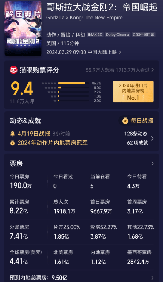 四月电影市场由进口片撑场,排第二的是《哥斯拉大战金刚2》,该片上映23天累计票房超过了8亿元,预计最终票房可能过9亿元冲10亿元,不及前作的12.32亿元。