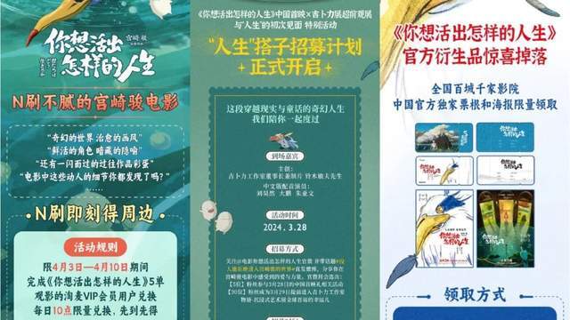 不只是展览,宫崎骏动画IP也电影上映期间开发更多衍生周边,比如《你想活出怎样的人生》吉卜力正版授权同名绘本同步开启预售,全国百城千家影院随机掉落中国官方独家票根和限量海报,与万达电影和好集了衍生周边平台的联动开发,激发观影受众的长线购买力。