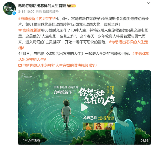 在“史上最强”清明档创下多项纪录后,由日本吉卜力工作室出品,中影进口发行、阿里影业协助推广的动画电影《你想活出怎样的人生》,热度和影响力还在持续。