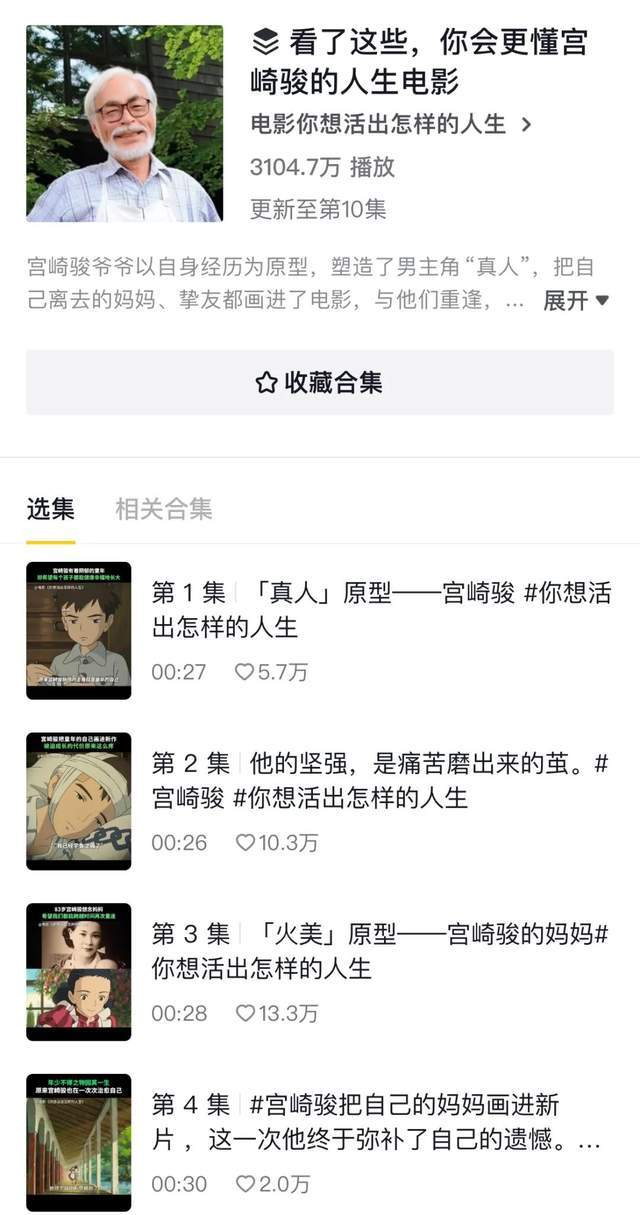 抖音官号在映前半个月陆续发布“看了这些,你会更懂宫崎骏的人生电影”系列,详解真人、苍鹭、大舅公的原型分别对应的是宫崎骏、铃木敏夫、高畑勋三人组,以及电影中真人的童年经历与宫崎骏人生呼应的解读。