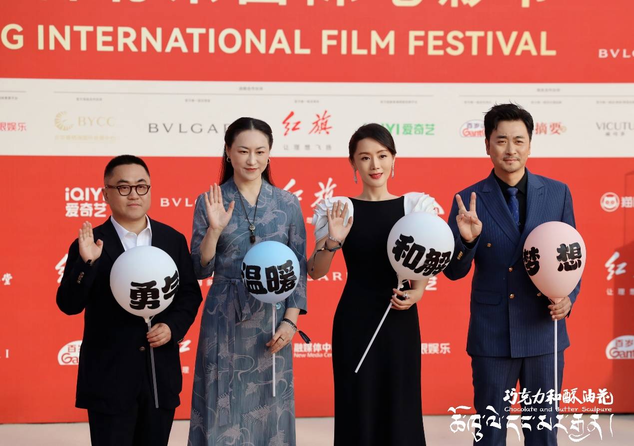 4月18日,第十四届北京国际电影节在北京隆重开幕。治愈系剧情片《巧克力和酥油花》主创亮相红毯,导演陈颖心和监制张冀,携演员车永莉、黄俊鹏共同出席。红毯上,各位主创手拿彩色气球,尽显天真童趣一面,让人耳目一新。而气球上“勇气”、“温暖”、“梦想”、“和解”等词语也传达出本片的治愈系特点。电影《巧克力和酥油花》将于今年暑期上映。