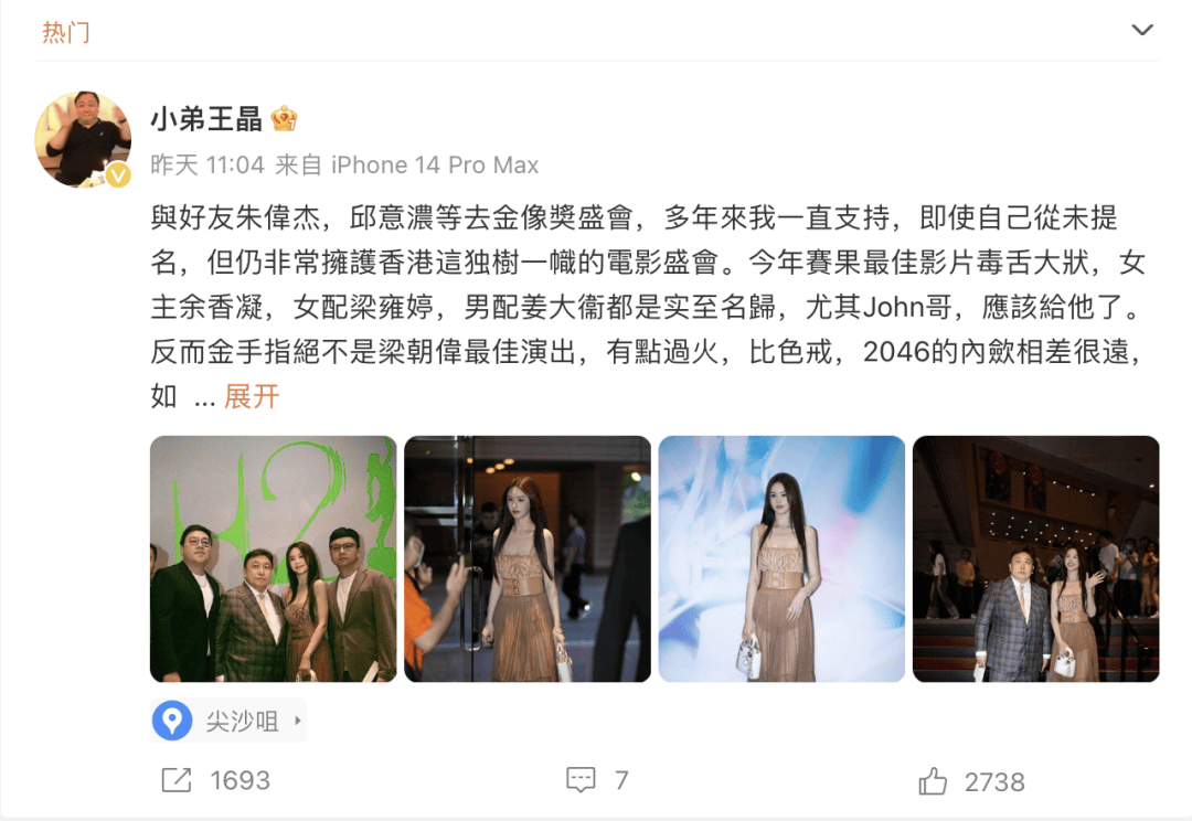 金像奖结束后不久,导演王晶发微博表示:「今年赛果最佳影片毒舌大状,女主余香凝,女配梁雍婷,男配姜大卫都是实至名归。反而金手指绝不是梁朝伟最佳演出,有点过火,比色戒、2046的内敛相差很远,如果我是他,会效法当年谭咏麟、张国荣宣布不再领奖,把机会给年轻一代。」