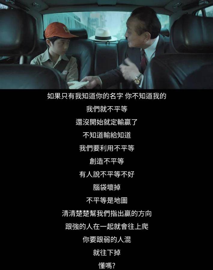 还有一个更深奥的道理就是不平等理论:“不知道输给知道,我们要利用不平等,创造不平等,不平等是地图,清清楚楚帮我们指出赢的方向”,还有强弱理论:“跟强的人在一起就会往上爬,你要跟弱的人混,就往下掉,懂吗?”
