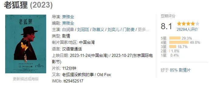 在豆瓣平台,《老狐狸》的最新评分为8.1分,好于85%的剧情片,口碑不输《周处除三害》,可惜的是,《老狐狸》没登上内地大银幕。