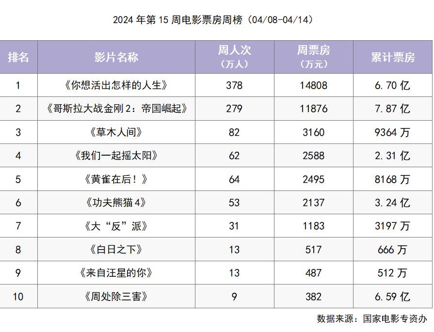 上周(2024/4/8-4/14)全国电影市场共收获票房4.2亿,火爆的清明档过后,市场大盘有所回缩,《你想活出怎样的人生》《哥斯拉大战金刚2:帝国崛起》《草木人间》位列周票房榜的前三名。
