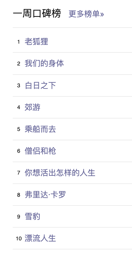 最后,还是例行附上一周豆瓣口碑榜的完整榜单: