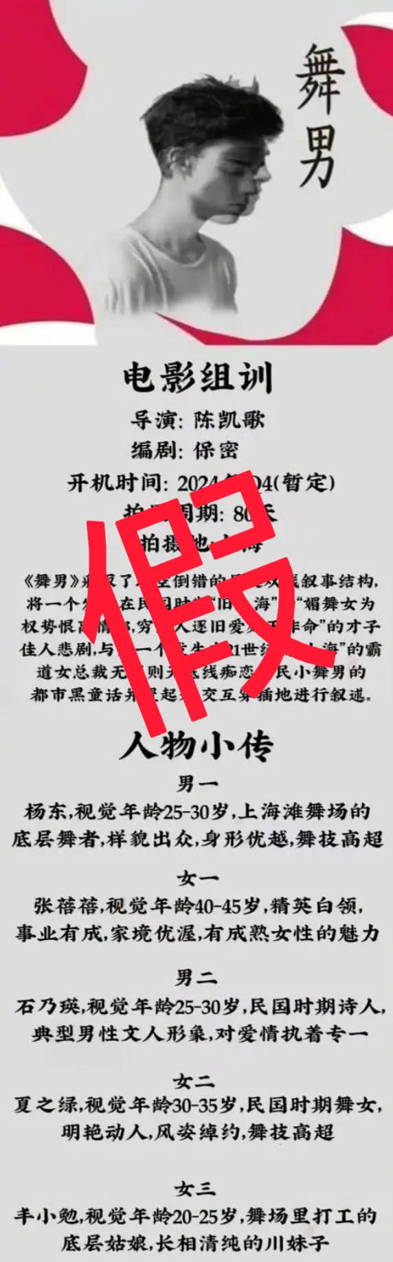 搜狐娱乐讯 近日,网传陈凯歌将执导电影《舞男》,主角或是王一博,引发诸多讨论。有媒体求证陈凯歌导演工作室,对方回应称相关报道均为不实传闻,陈凯歌导演从未收过电影《舞男》的执导邀约,也未曾委托过任何主体发布过组讯信息,后续亦无该电影相关的执导计划,“任何假借陈凯歌导演名义进行招商融资和招募演员的行为皆与陈凯歌导演团队无关,请广大网友勿轻信谣言。”