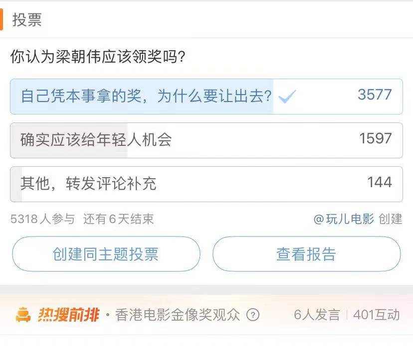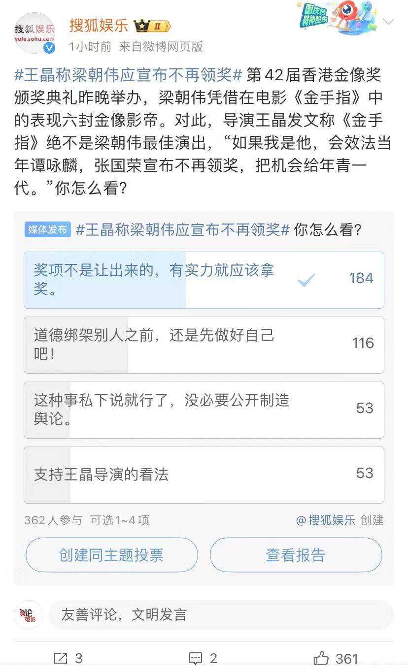 内地媒体针对王晶的说法进行投票选项,大多数网友认为自己凭本事拿的奖,为什么要让出去?少部分是认为应该给年轻机会。